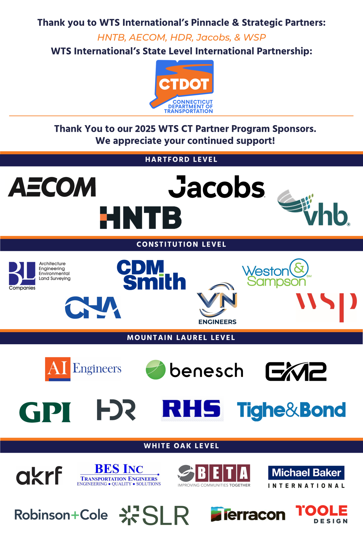 The 2025 WTS CT Partner Program is an annual sponsorship that runs from January 1st through December 31st. The Partner Program Commitment Form must be received by February 28, 2025, for advertisement and recognition during Women’s History Month in March and the annual WTS CT Membership Open House event at the Connecticut Department of Transportation on Wednesday, March 5, 2025. Payment must be received by March 31, 2025.